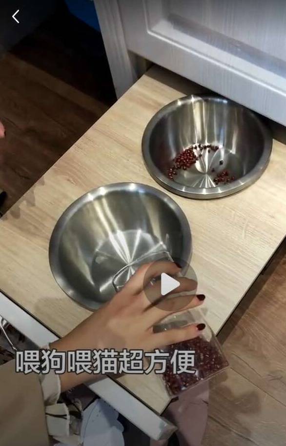 你有没有想过,给橱柜最底层安装一个抽拉层板,上边放两个宠物食盆,如此一来,会避免放在地面处的尴尬,另外,还将闲置的空间给利用到了极致,地面的空间得到了很大的释放,猫狗等宠物进起食来也更加安全卫生!作为主人来看,喂起食物来也更加方便呢!